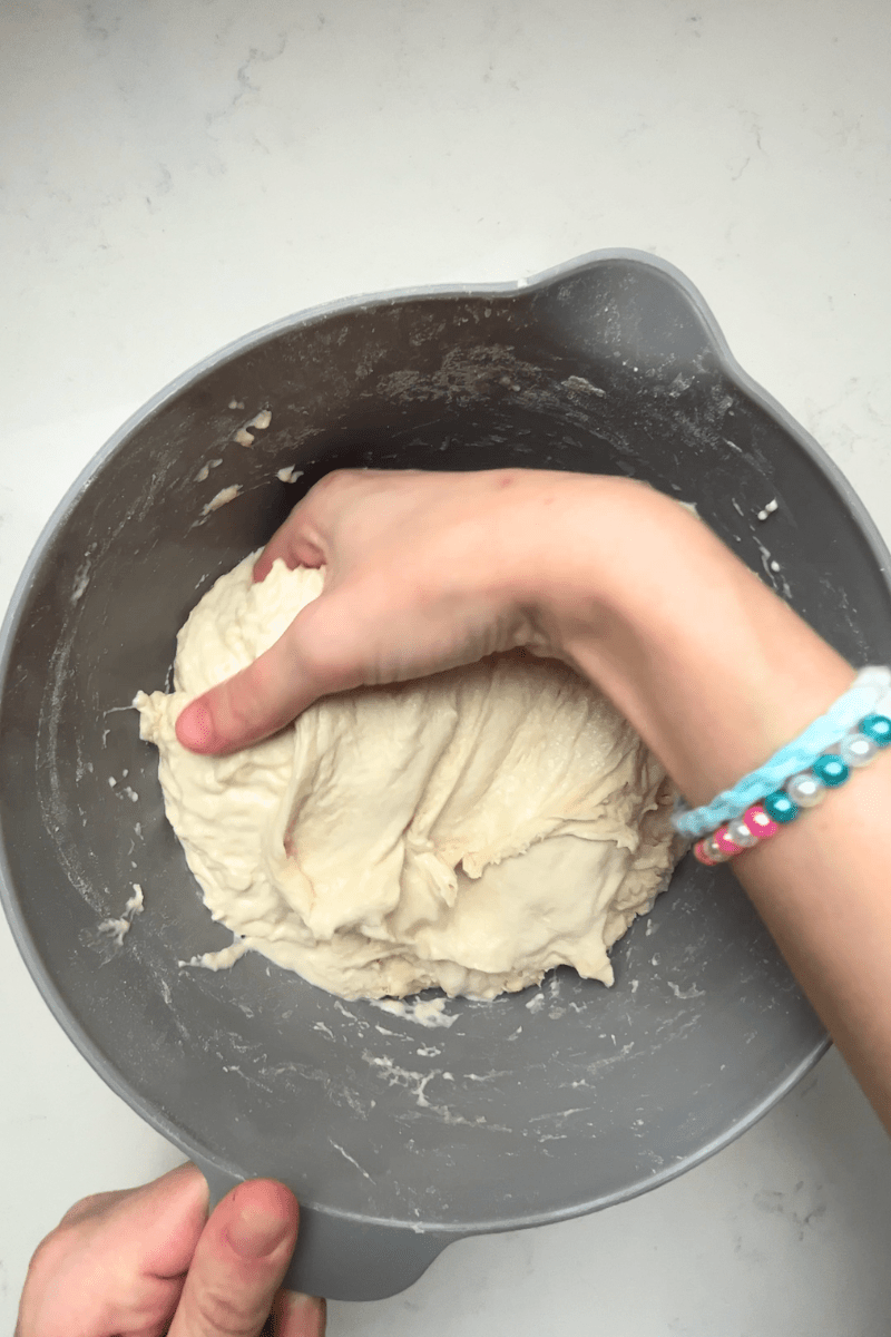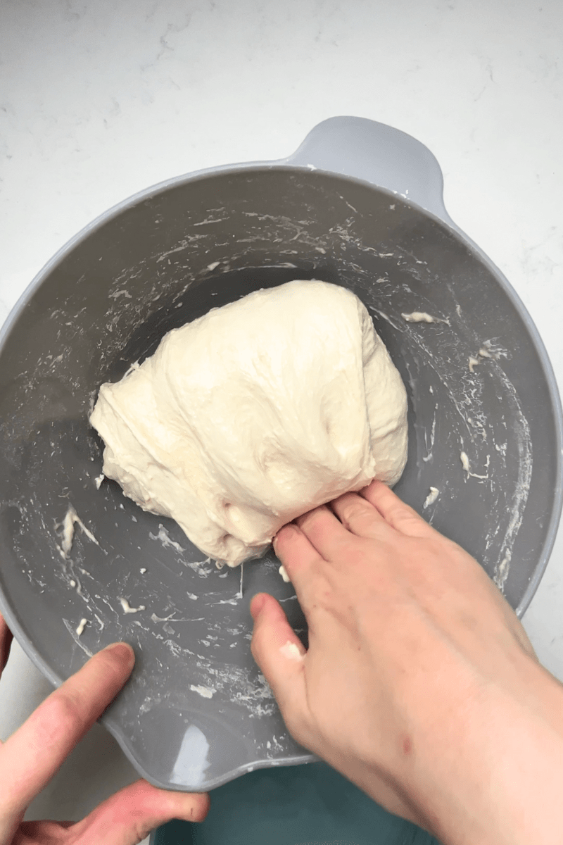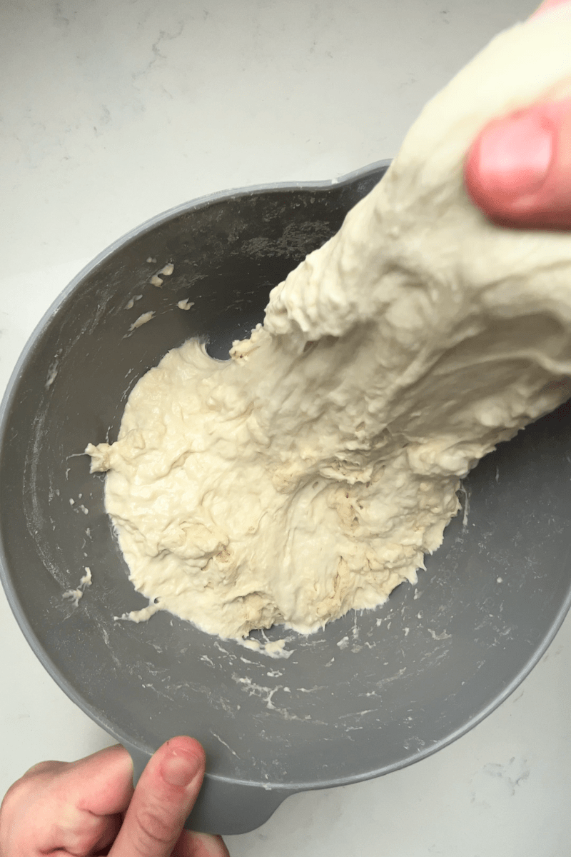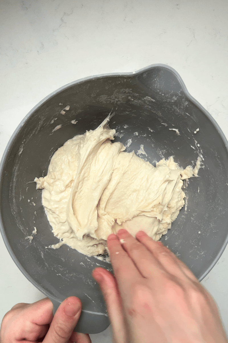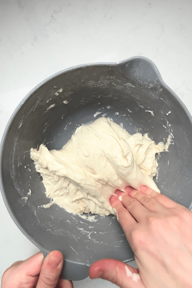 - Gently lift one side of the dough and fold it over the center. Repeat with the other three sides. This helps strengthen the dough without traditional kneading. Repeat this process every 15-30 minutes for the first 2 hours.