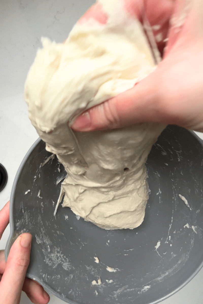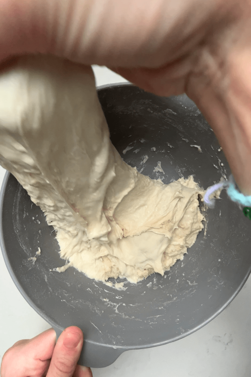 By the 3rd and 4th stretch and fold, the dough should be very elastic and strong. You shouldn’t have to wet your hands as much, since the dough will be a lot less sticky.