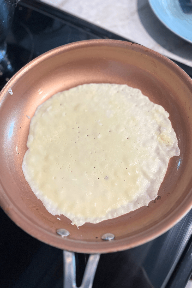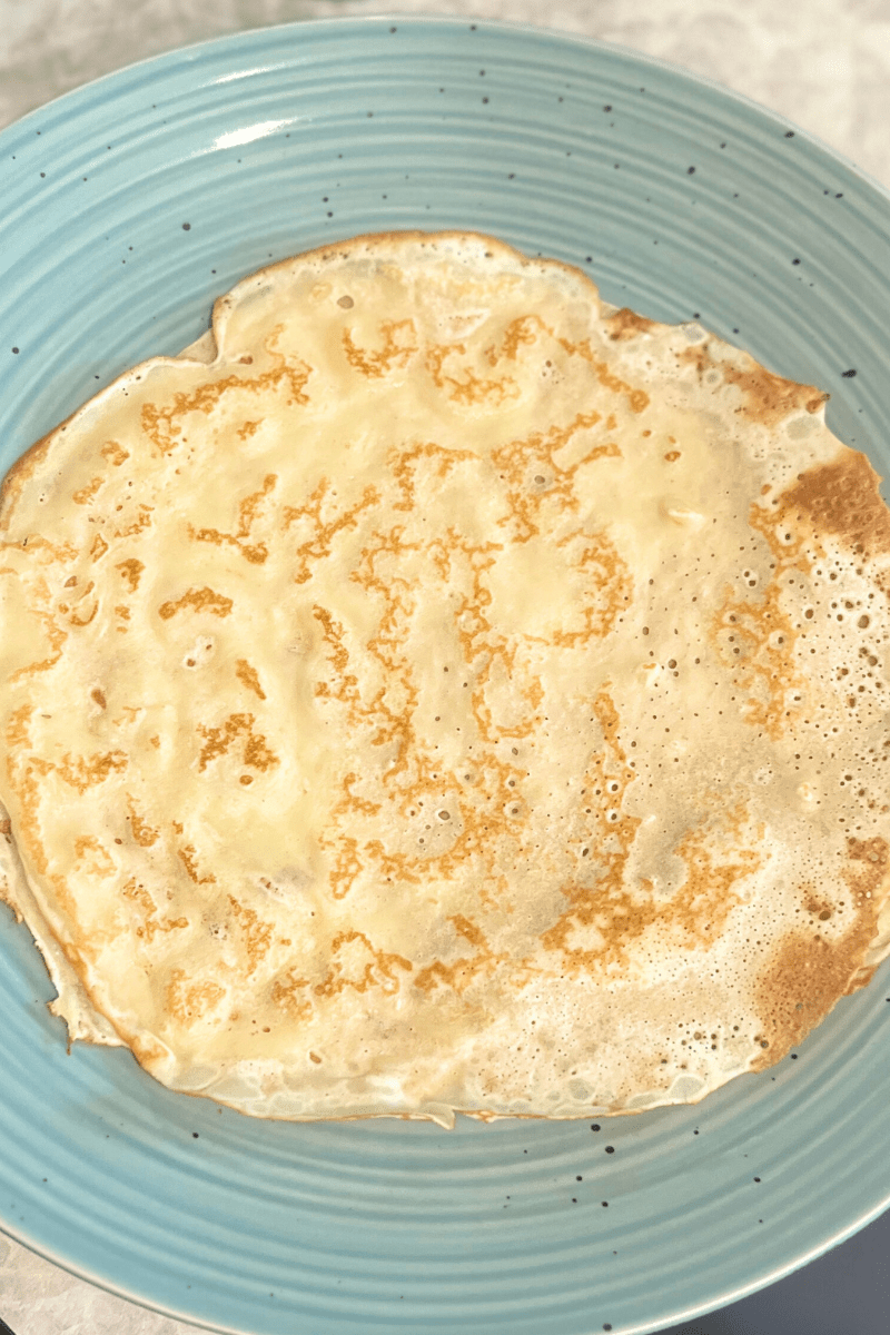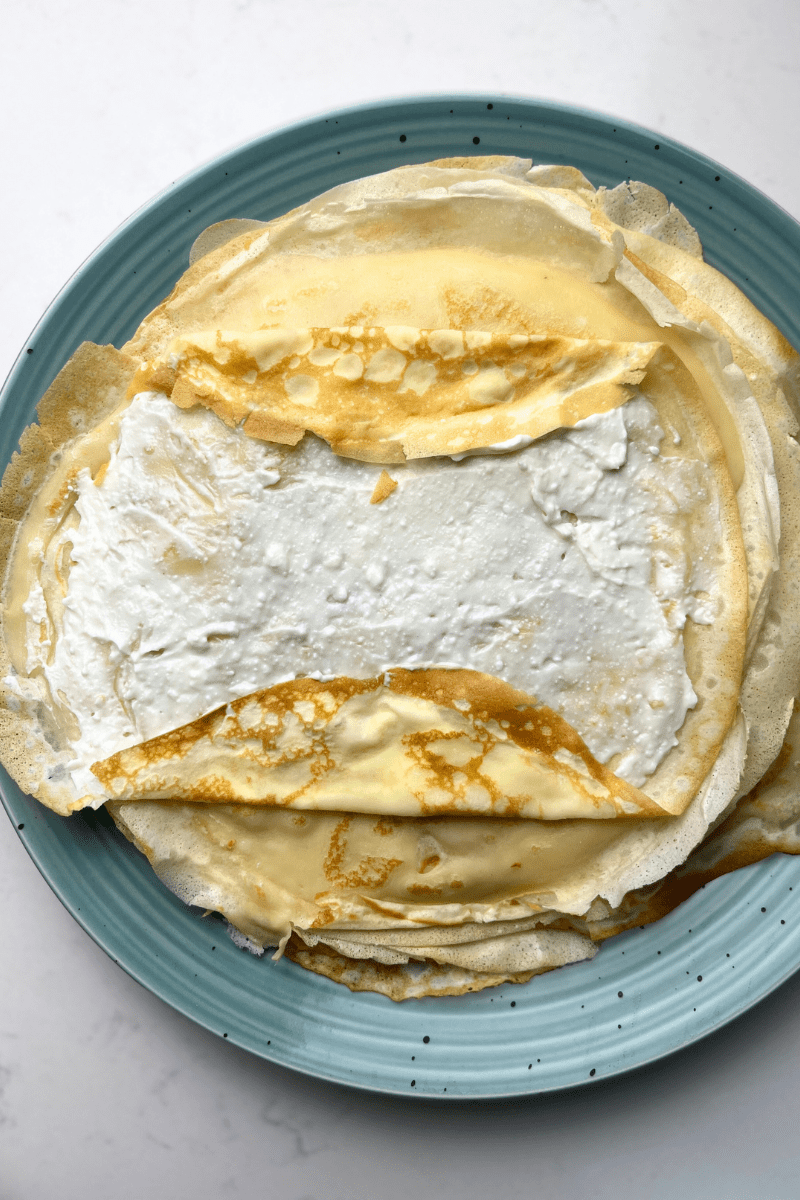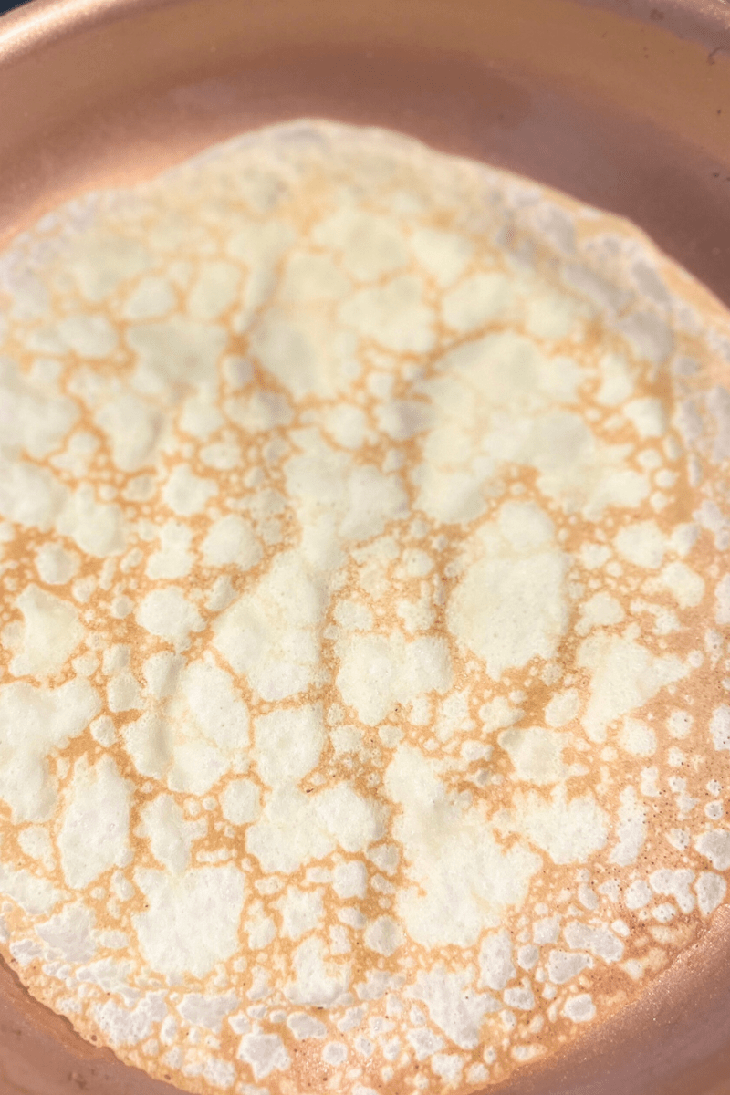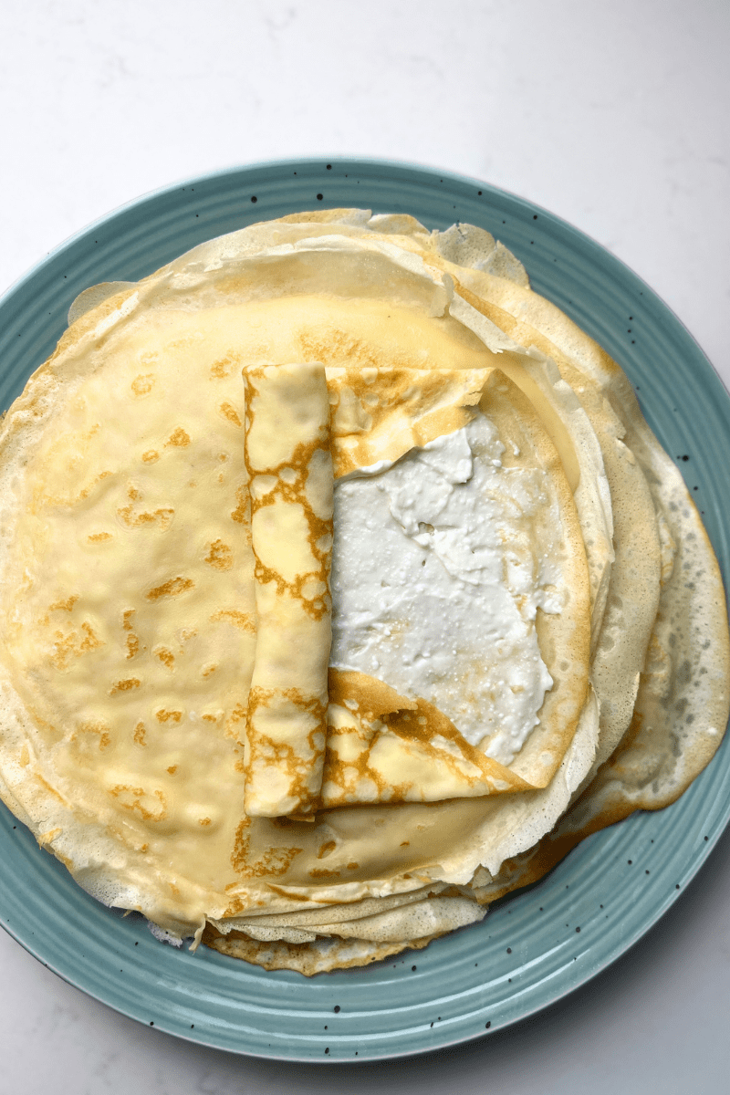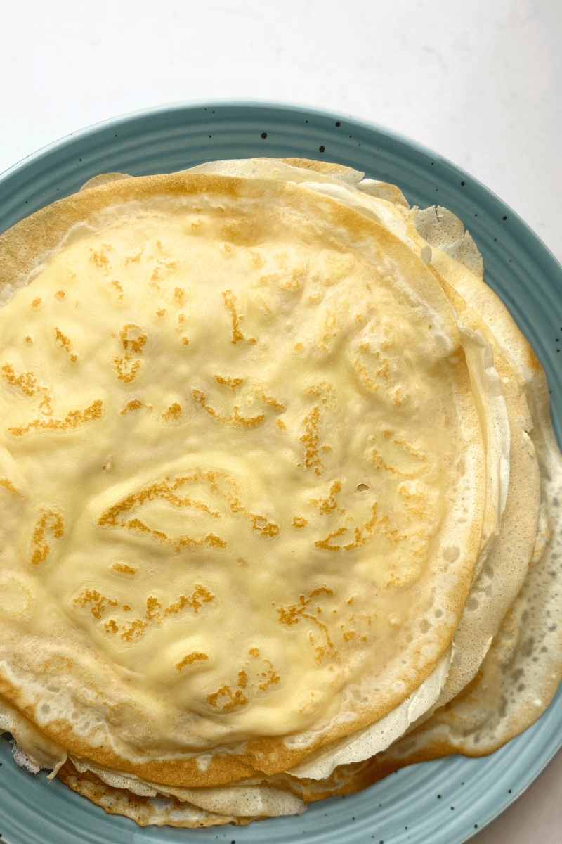 - Flip and fry for about 5 seconds, stacking the crepes on a plate to cool.