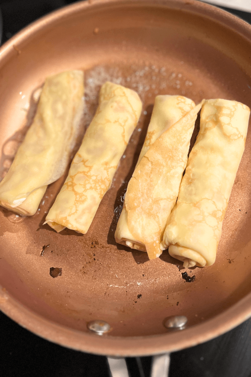 - Once cooled and you completed frying all of the crepes, spread about 3 tbsp of the filling on each crepe and roll.