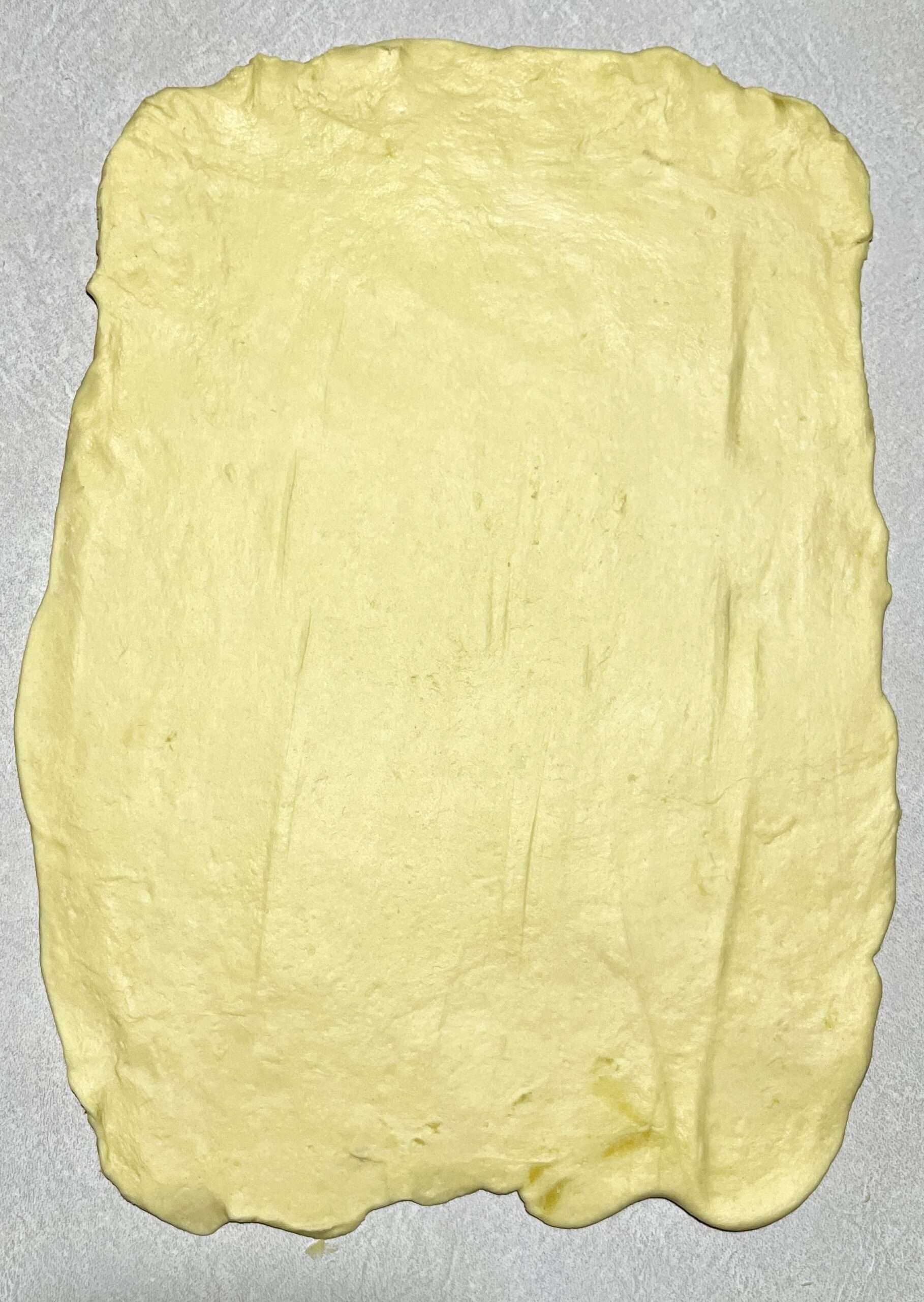 - In the morning: Your dough will be firm and easy to work with. Place the dough on a slightly floured counter top and roll it out into a rectangle about 10 inches wide and 12 inches long.