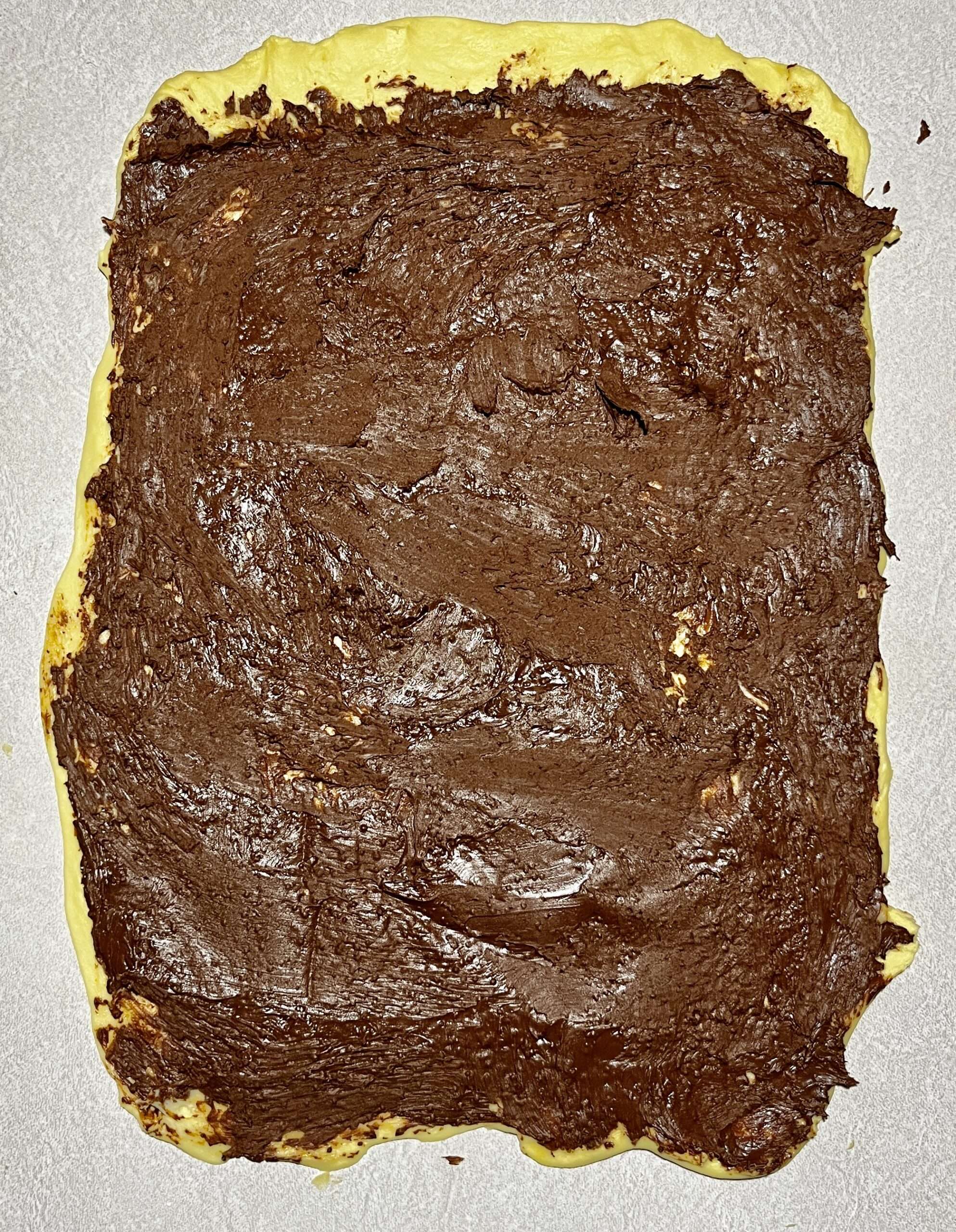 - Spread 13 oz jar of Nutella all over the dough, leaving the top half inch without Nutella.