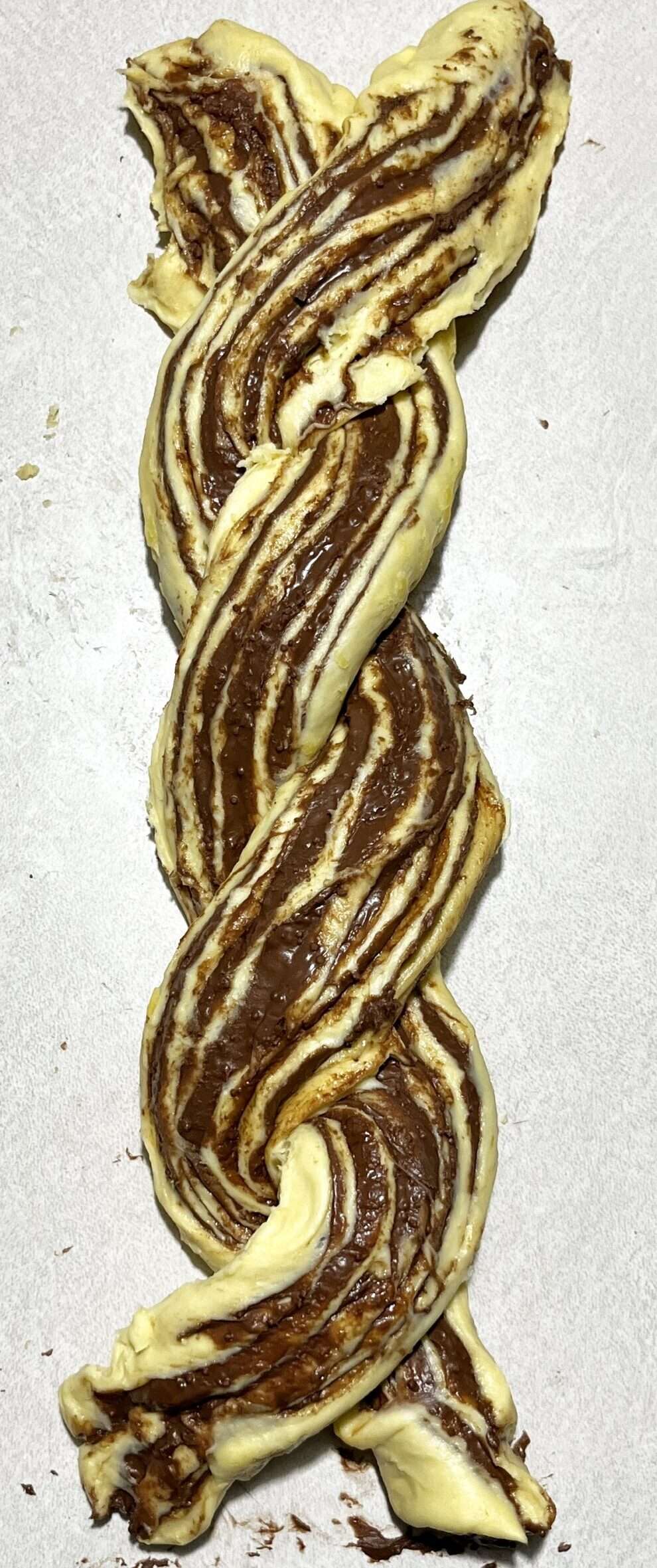 - Starting from the top, twist one half over the other half, making sure the middle part that shows the chocolate is facing up.