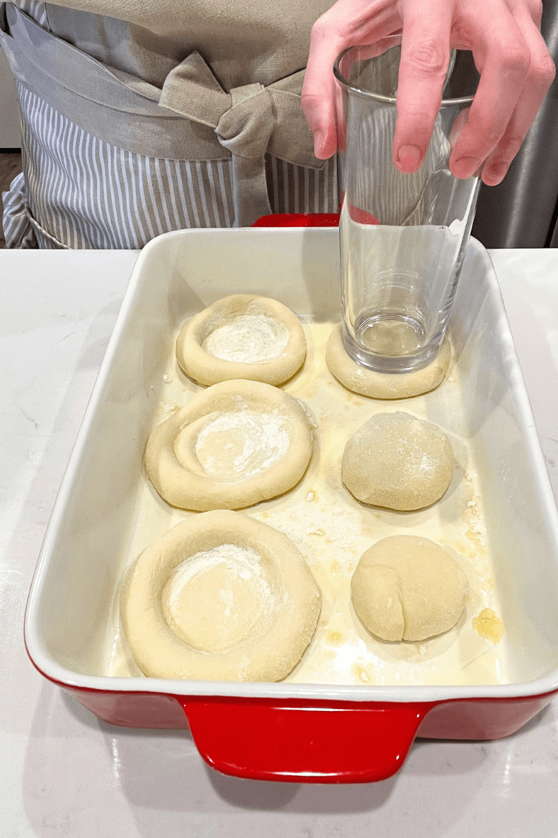 - Using a floured bottom of a jar or a glass, press the middle of the dough ball to make a well.