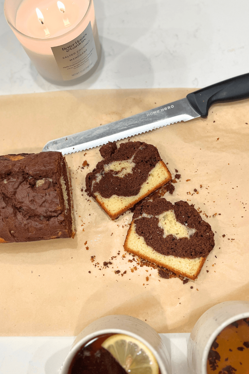 The irresistible goodness of this sourdough marble loaf cake is truly amazing. With a slight tang from the sourdough blended with the sweet vanilla and rich chocolate making this treat perfect for a tea party, special brunch, or a surprise treat for your family. The texture is moist and tender, adding to the overall enjoyment of this simple yet delicious cake.