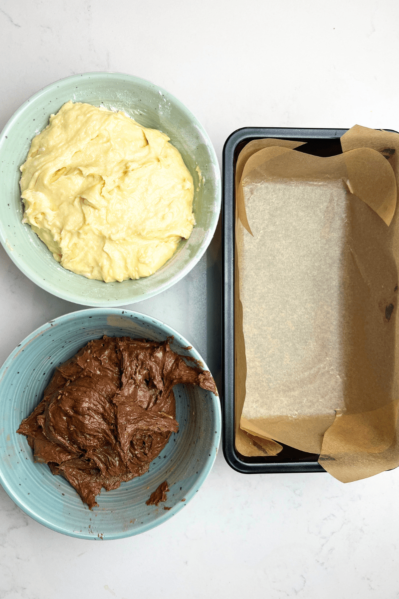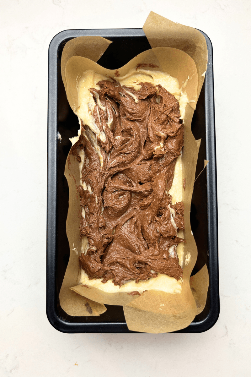 - Spread the remaining 1/4 of the vanilla batter and using a knife make a zig zag in the batter to create more of the marble effect.