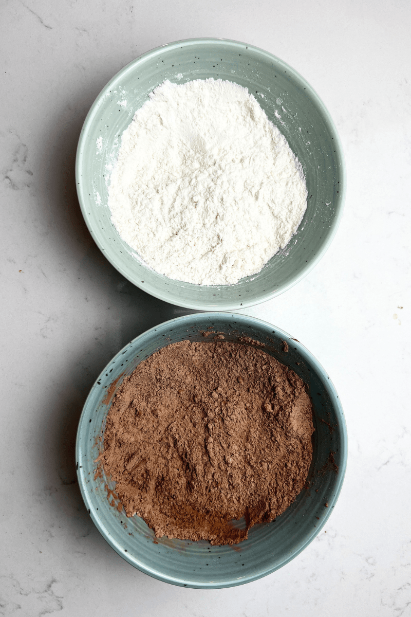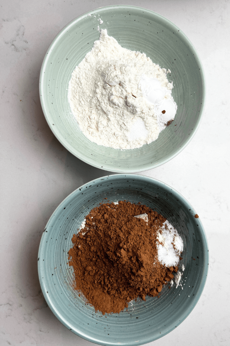 - In a separate bowl add the chocolate dry ingredients with the second half of the wet ingredients.