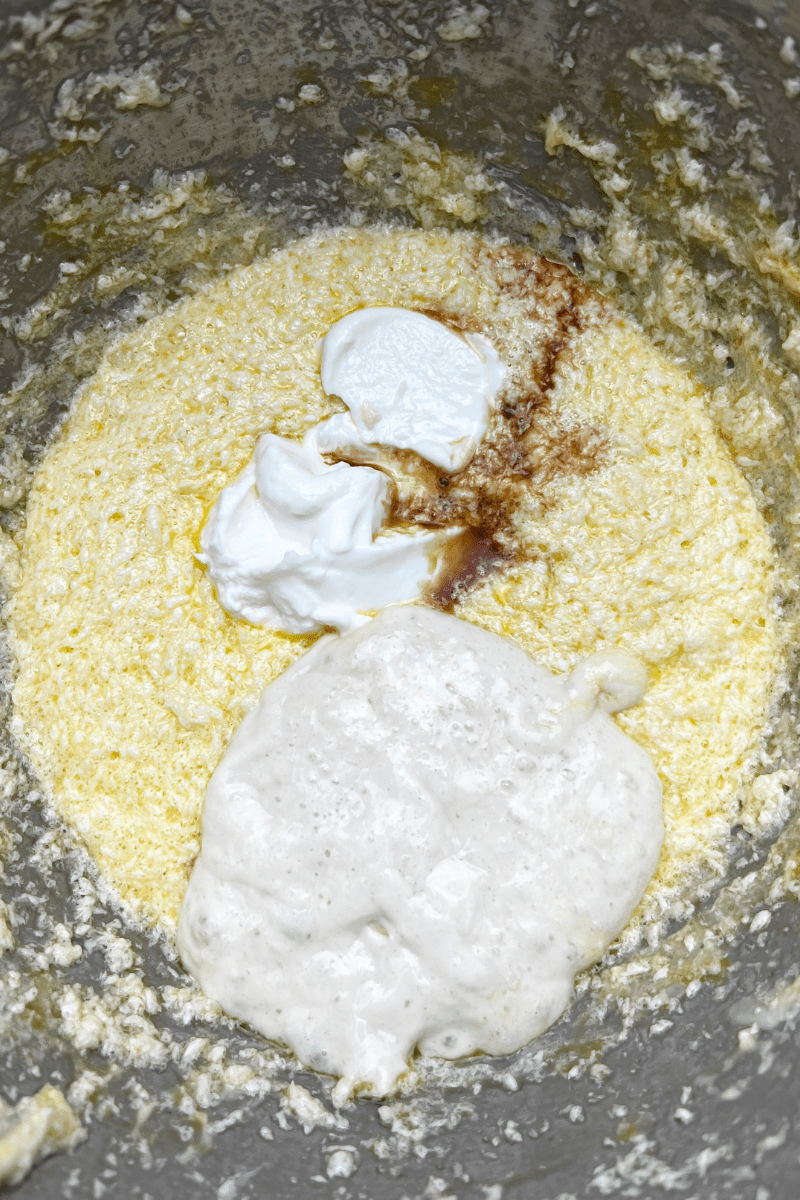 - Add in 1/2 cup sourdough starter and mix for 1 minute.
