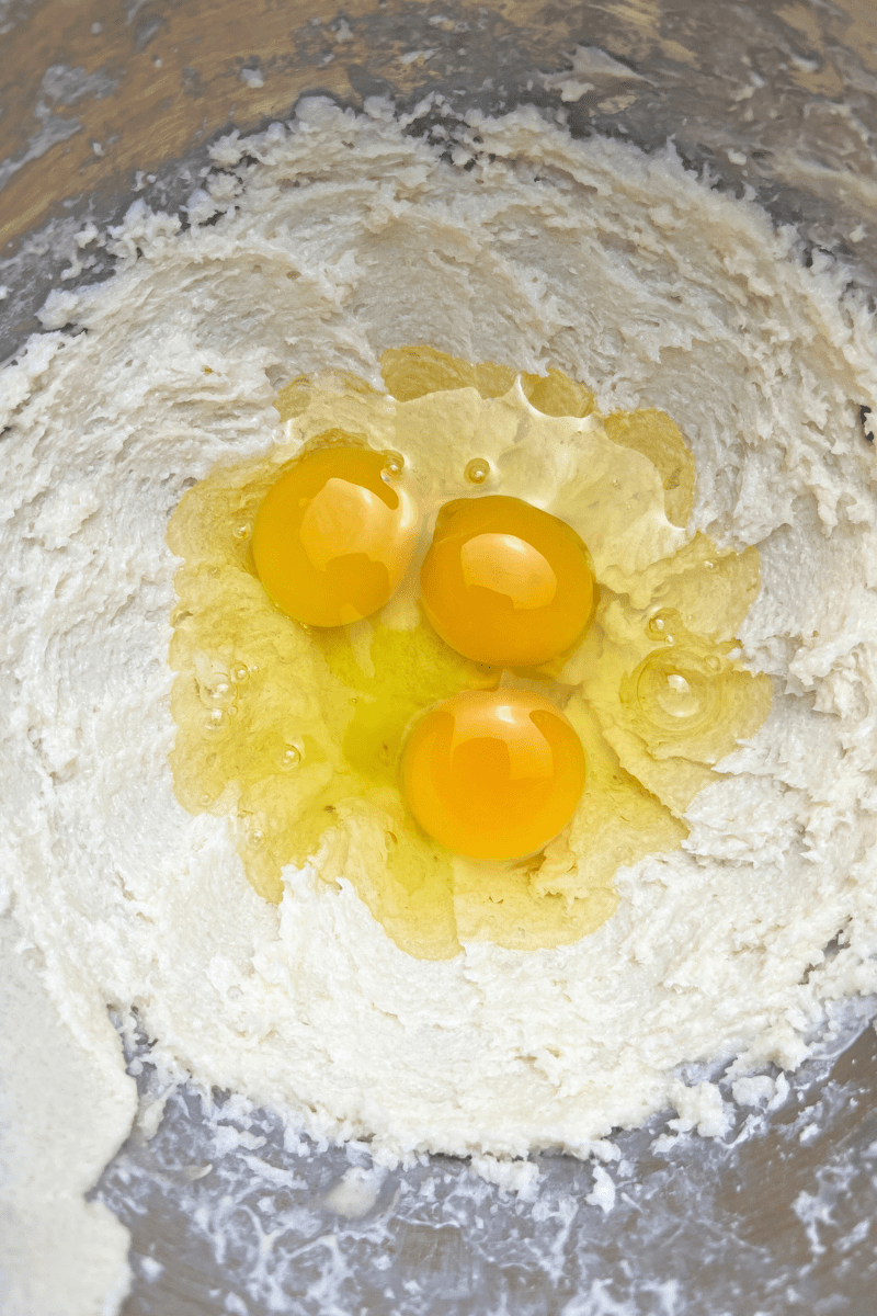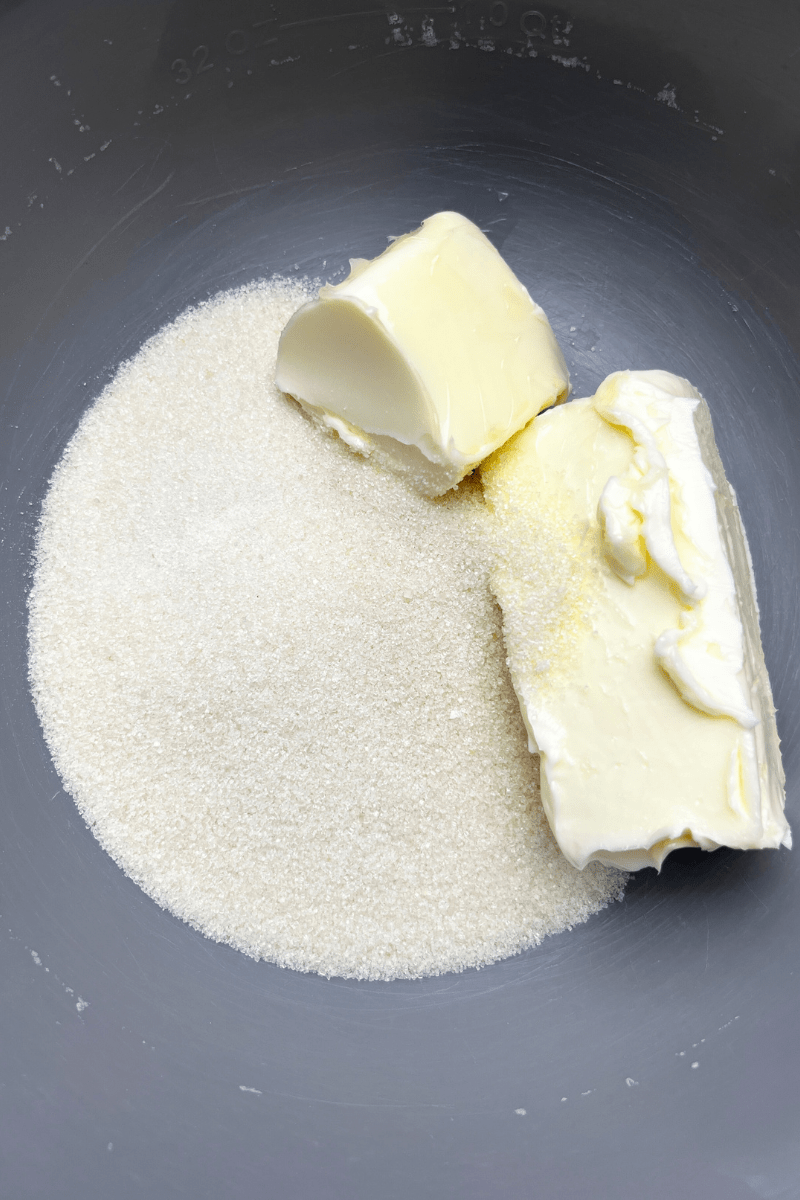 - In the kitchen aid mixer cream the 2/3 cup softened butter with 2/3 cup granulated sugar. Mix for 3 minutes on medium speed until light and creamy.