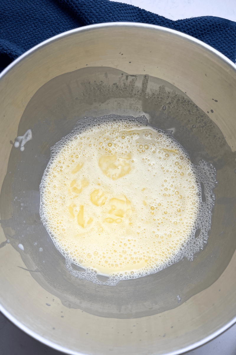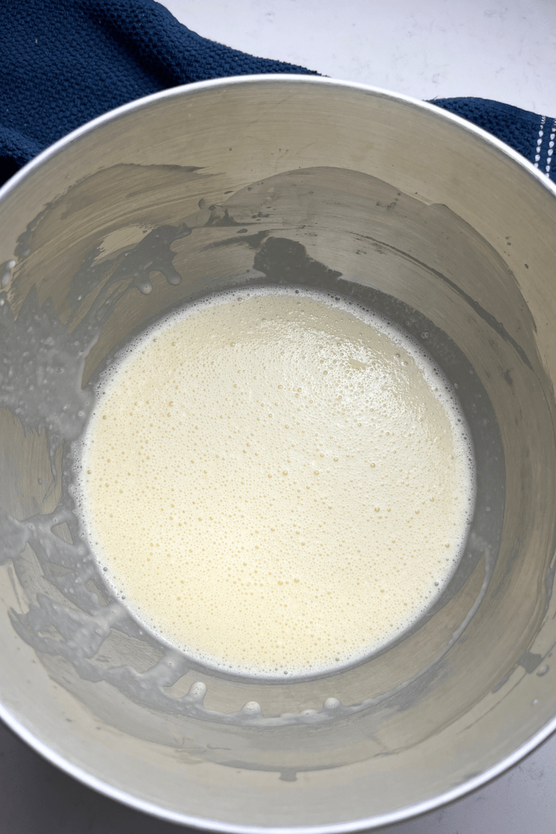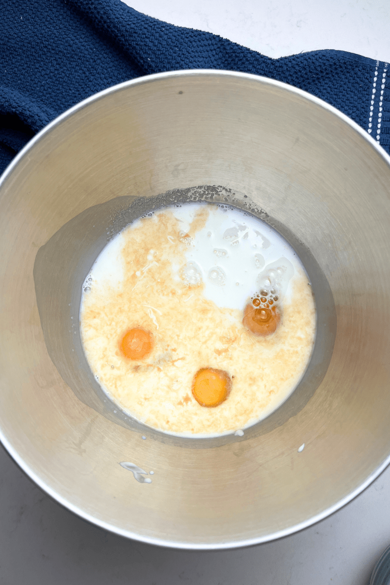 - Mix milk, sourdough discard, eggs, sugar, salt, vanilla for 1 min.