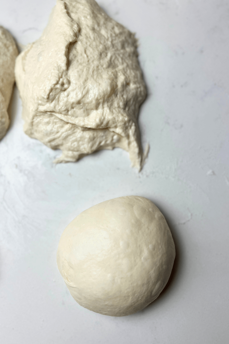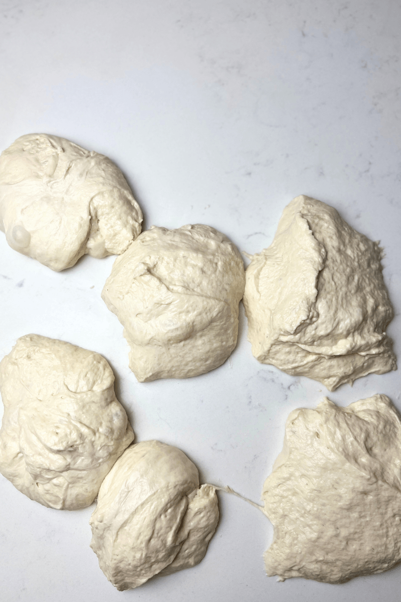 - In the morning, place the fermented dough on the counter and divide into 6 small balls or 4 larger balls (depending on how big you want your bowls).