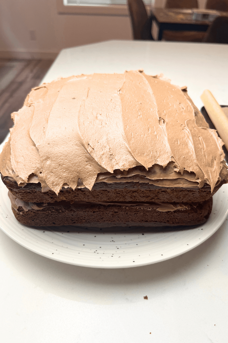 Bonus tip: I like to shave a little bit of chocolate on top of the cake just for looks.