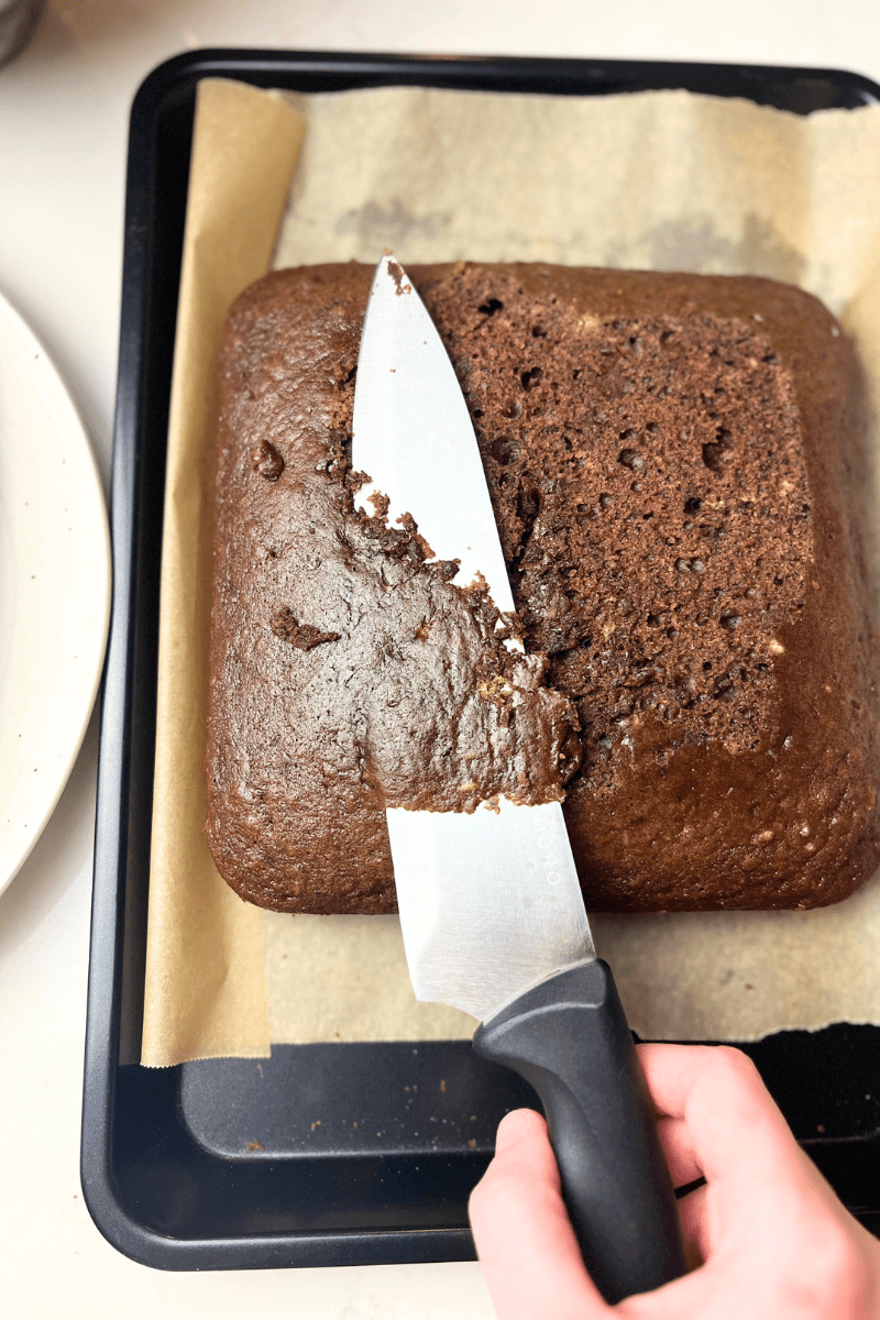 - Remove the cake from the pan onto a parchment paper upside down. This will help flatten the top of the cake a bit.