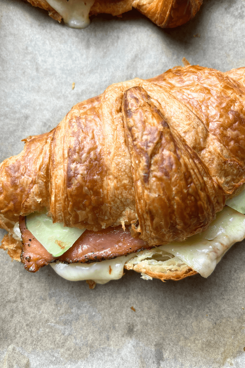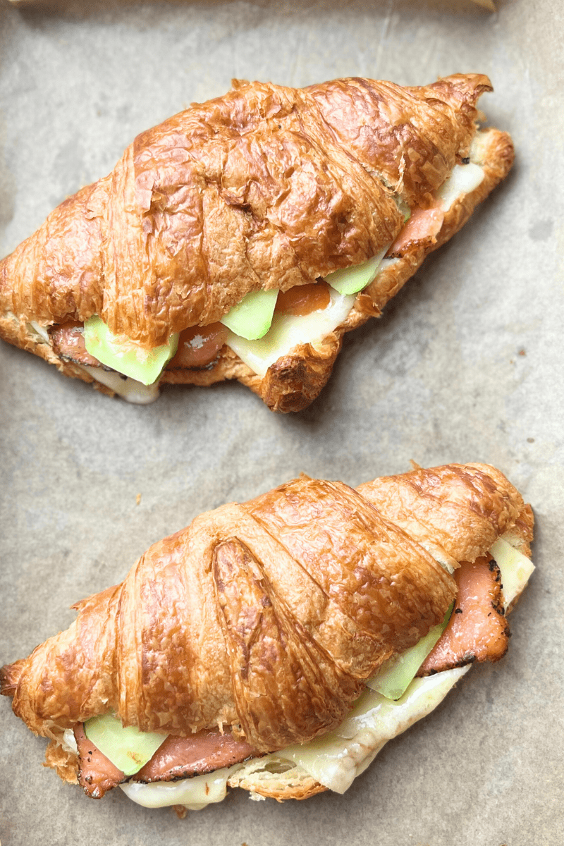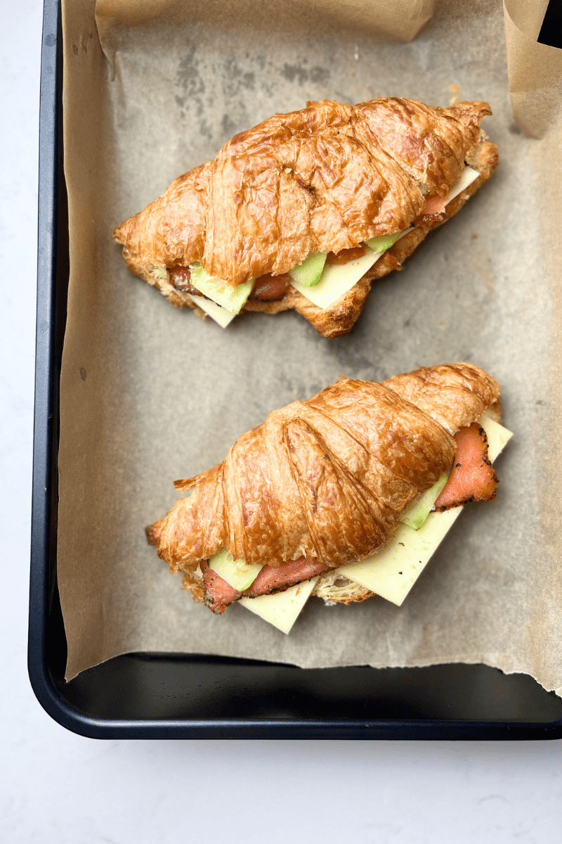 - (Optional) Place the assembled sandwiches on a baking sheet and toast them in the preheated oven for about 5-7 minutes or until the croissants turn golden and the cheese starts to melt.
