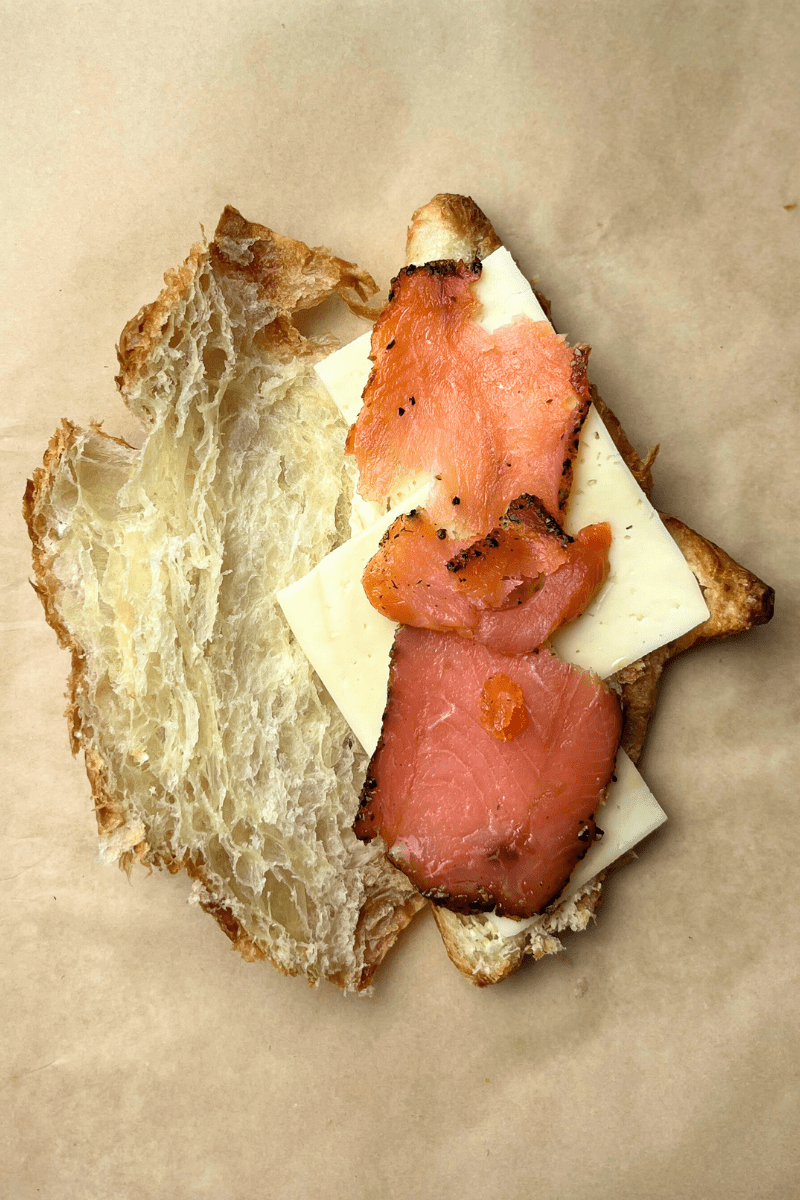 - Salmon: The star ingredient, imparting a robust and savory flavor to the sandwich. I love buying smoked sliced salmon from Costco. 1- Smoked Norwegian salmon or 2 -Kirkland alaskan smoked sockeye salmon.