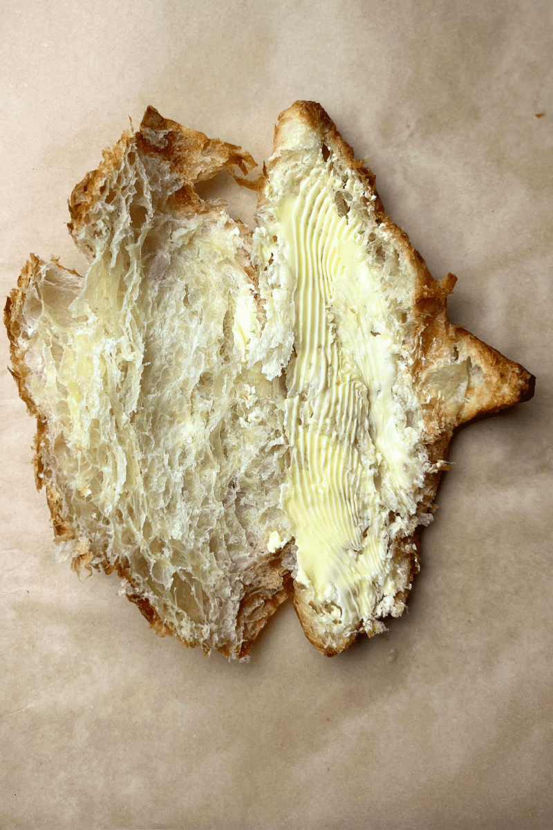 - Spread a generous layer of unsalted butter on the cut sides of the bottom croissant half.