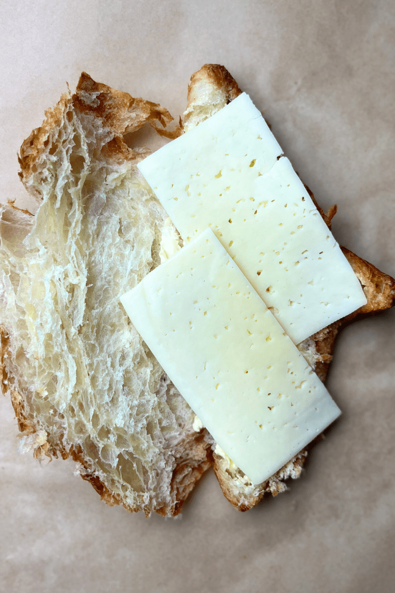 - Place a few slices of havarti cheese on the bottom half of each croissant.