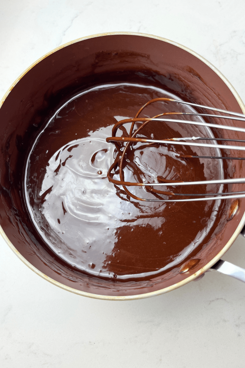 - Once the melted butter and chocolate chips have cooled. Add it into the wet ingredients and whisk to create a creamy smooth mixture.