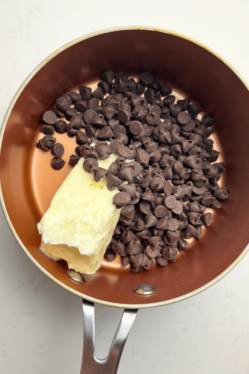 - In a small saucepan, melt chocolate chips with butter.