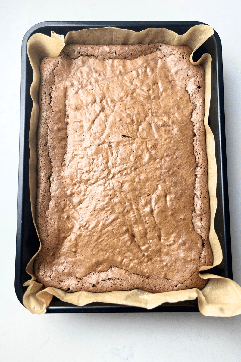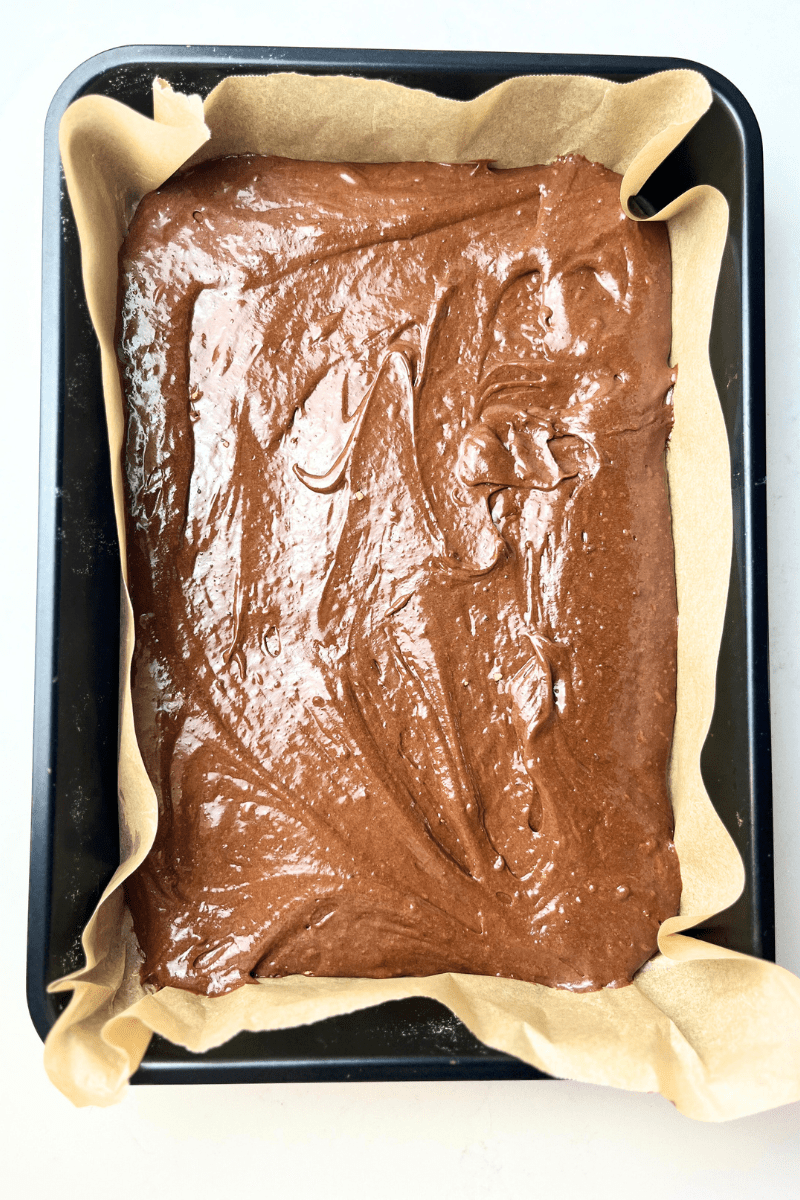- Pour the batter into a 9×13 baking pan lined with parchment paper.