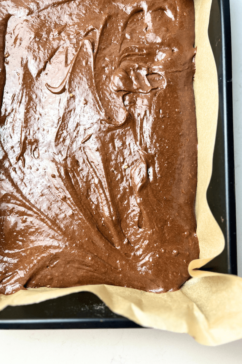 - Pour the batter into a 9×13 baking pan lined with parchment paper.