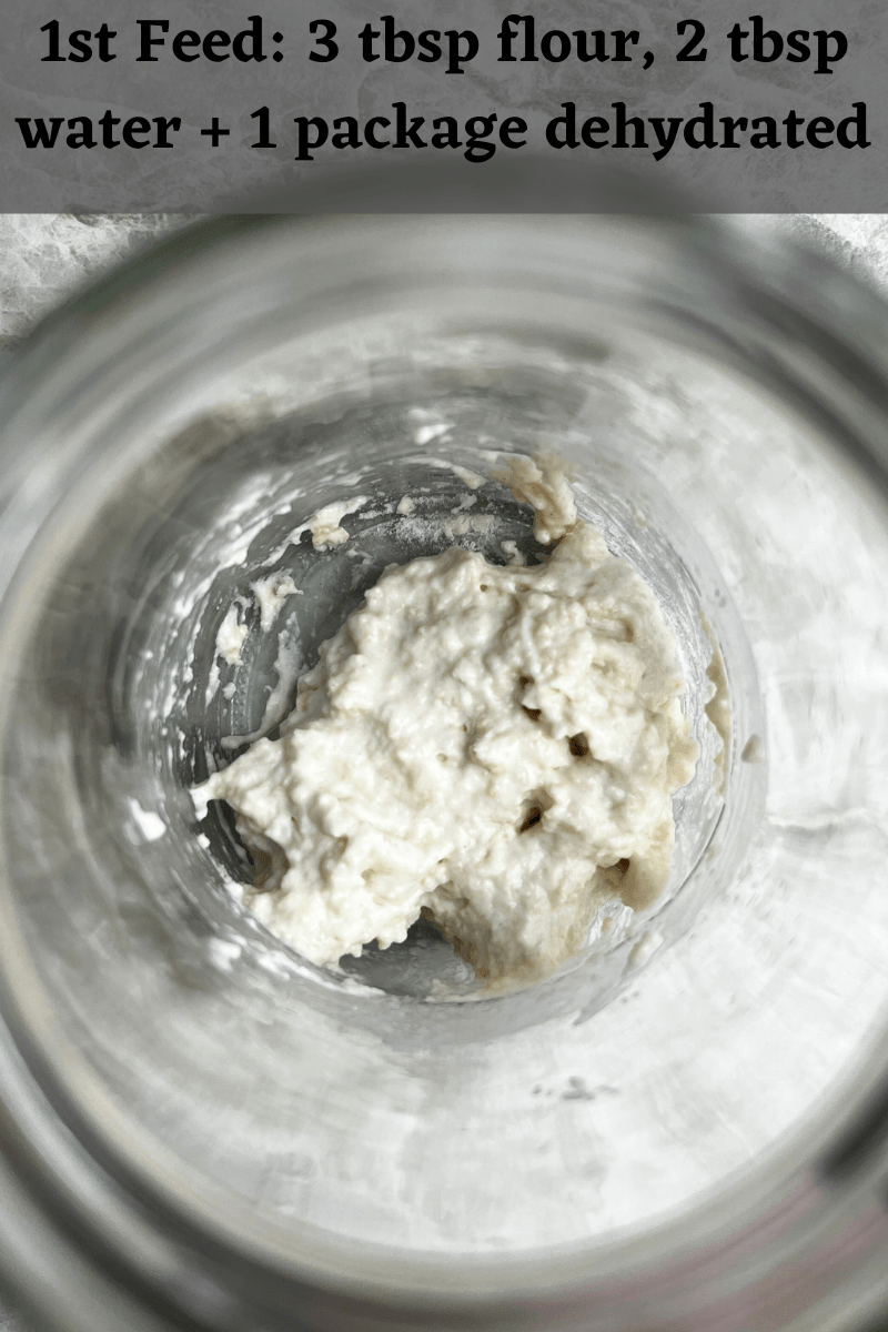 1. (Evening) In a clean jar, add dehydrated sourdough starter powder (about 10-15 grams), 3 tbsp flour, and 2 tbsp water. Mix well to create a thick batter.