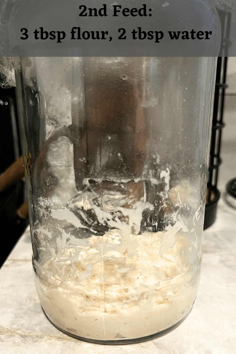 3. (Morning) Your starter should start showing signs of fermentation, such as bubbles and a slightly sour smell. stirring until well combined. Feed it again 3 tbsp flour and 2 tbsp water, stir well. Cover with plastic and let it sit on your counter until the evening.