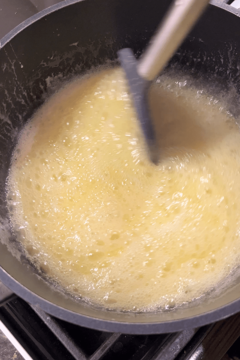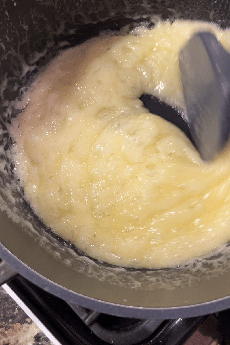 - The mixture will start to foam and bubble. Keep stirring. It will go through stages of colors from light (white) to latte, to caramel color. You can use a candy thermometer and remove the caramel from the heat at 300 degrees F.