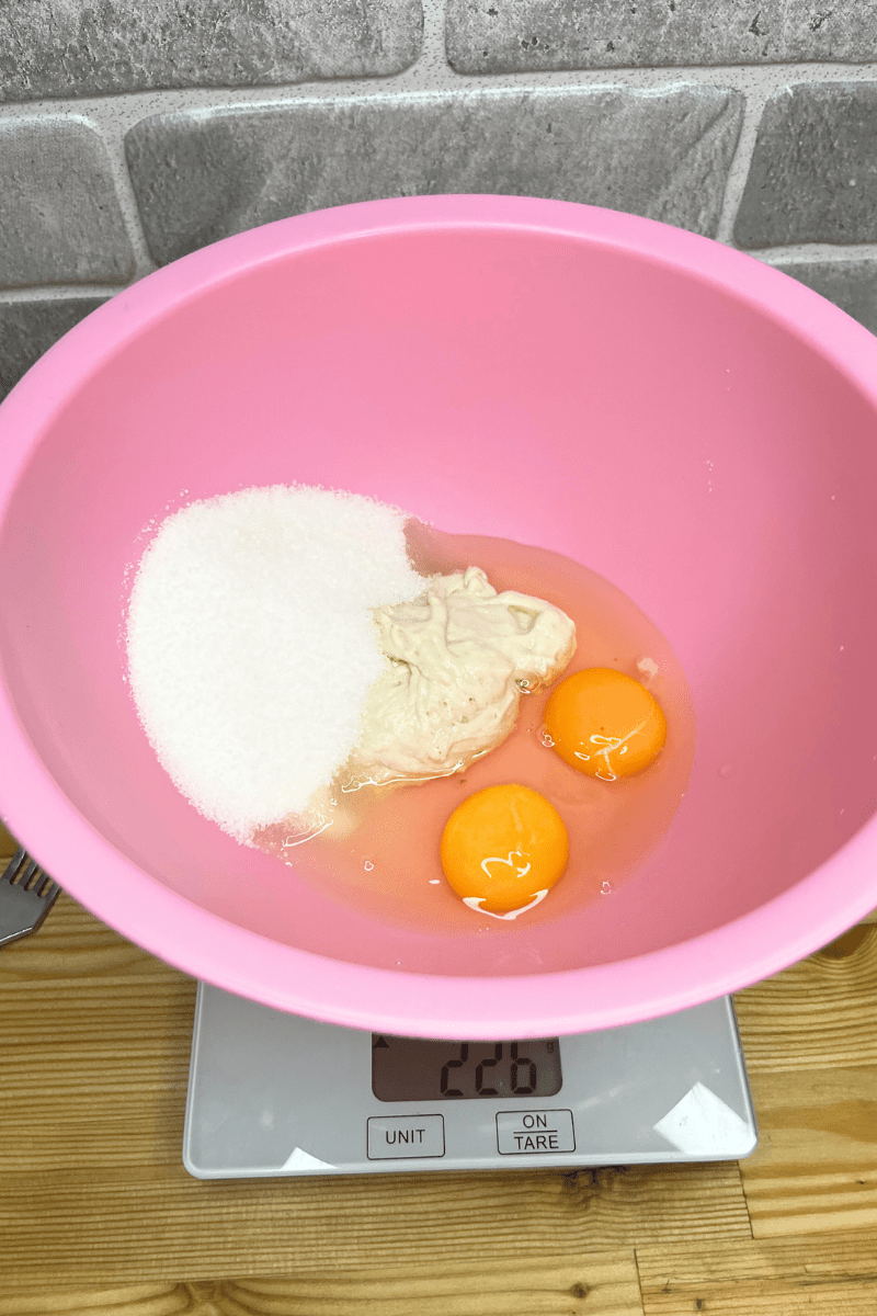 - First in a large mixing bowl mix together sourdough starter, eggs, sugar, and sour cream until smooth and creamy.