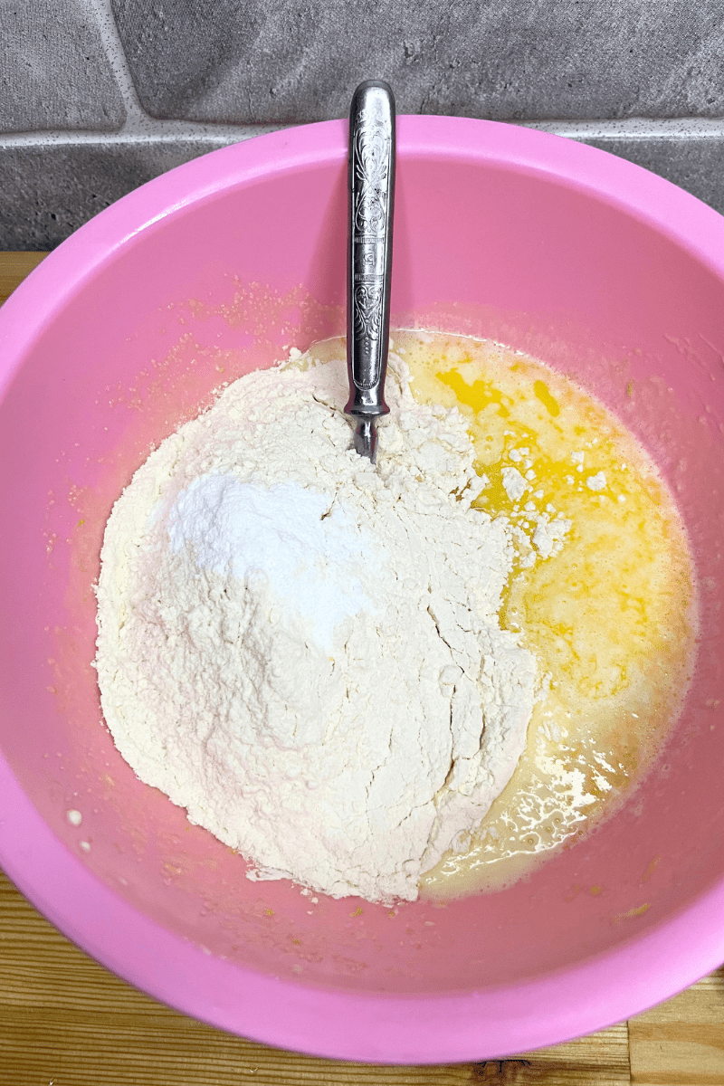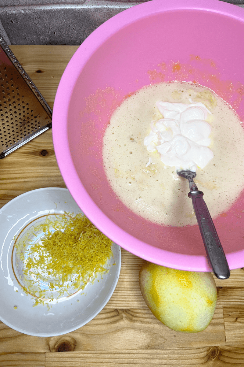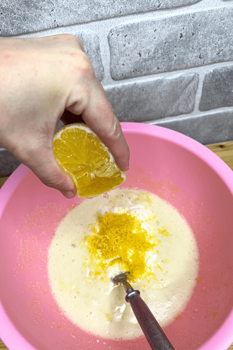 - After that add in cooled off melted butter, lemon zest, lemon juice and mix all together.