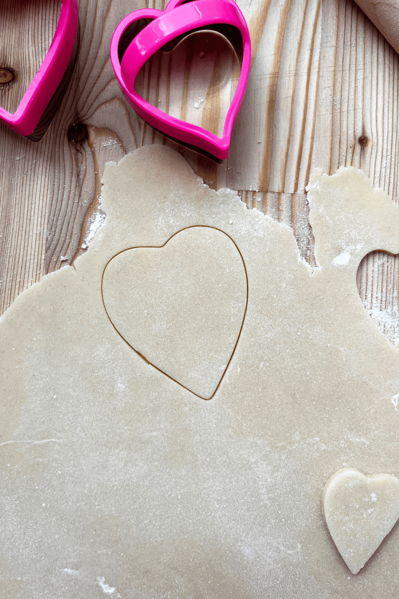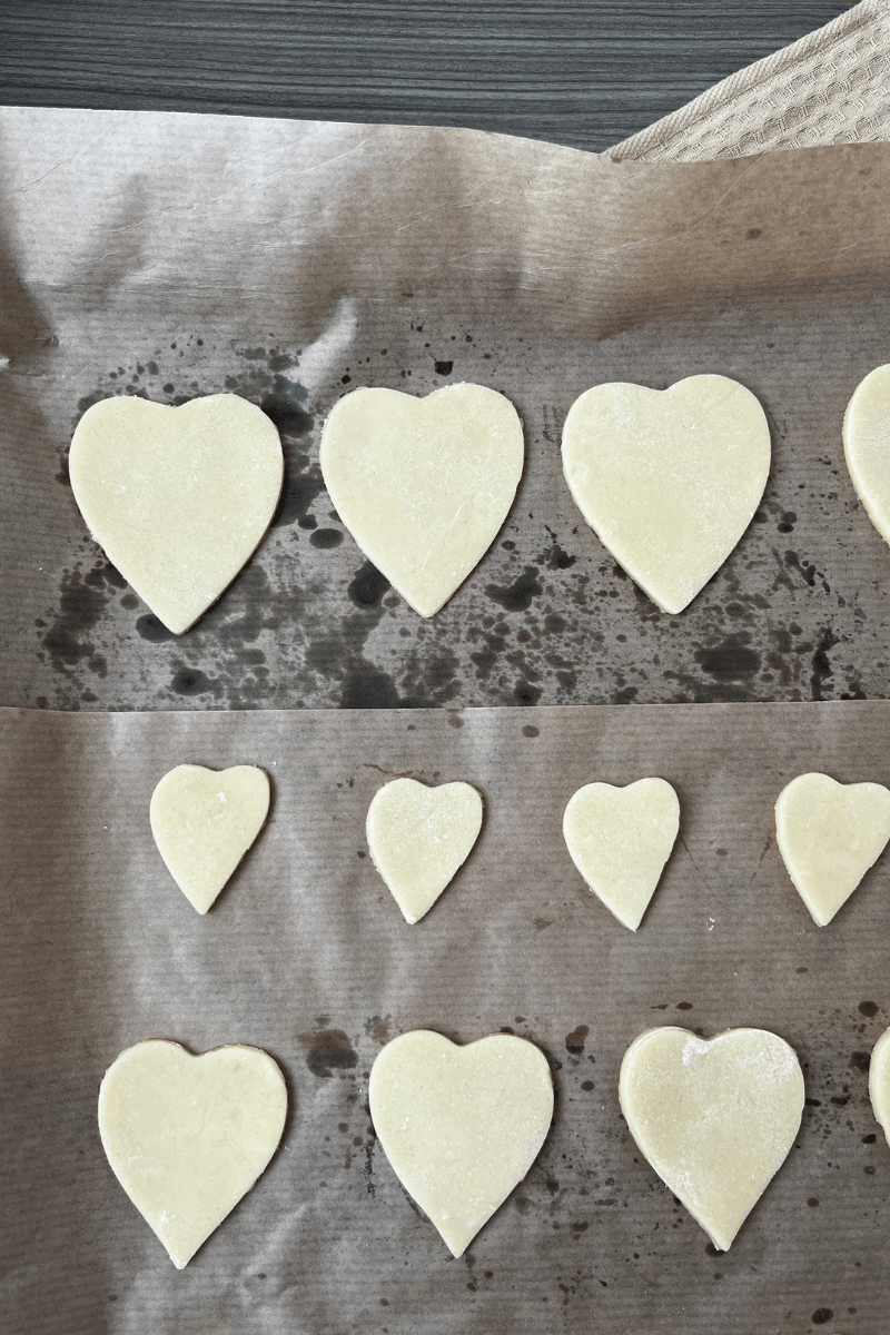 - Use a heart-shaped cookie cutter (or any shape you like) to cut out cookies and place them on the prepared baking sheet.