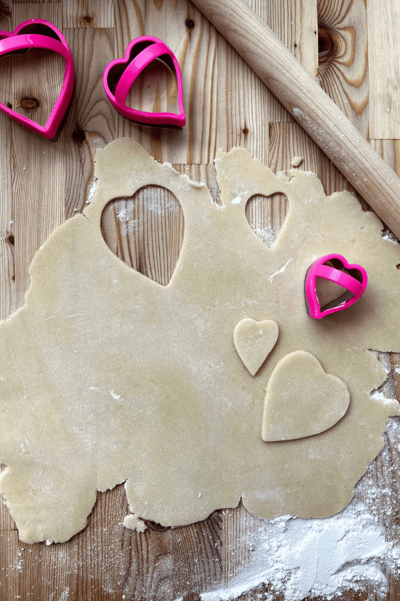 3. Use a heart-shaped cookie cutter (or any shape you like) to cut out cookies and place them on the prepared baking sheet.