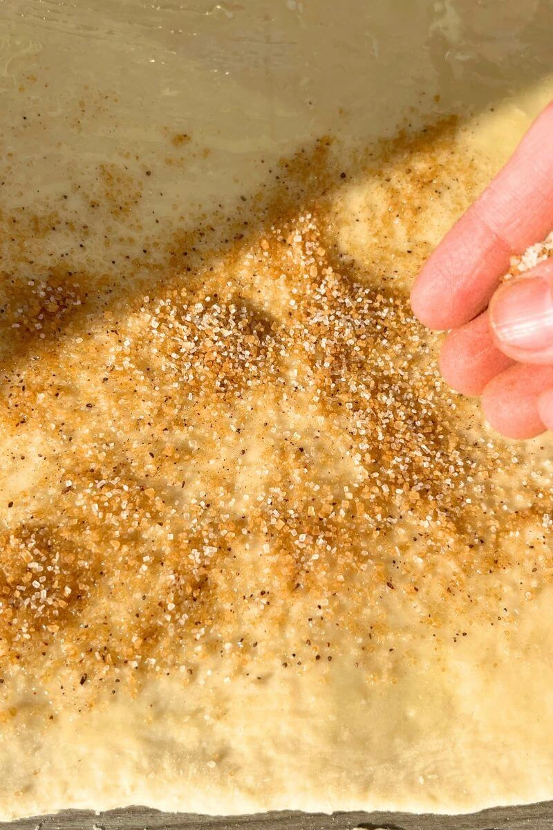 - Then sprinkle the cinnamon-sugar mixture across the surface.