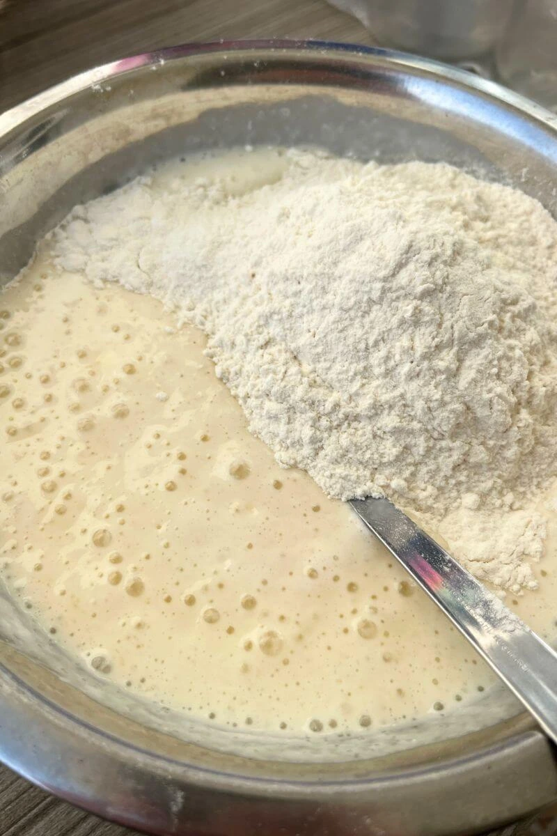 - Gradually add the wet ingredients to the dry ingredients, stirring until a soft dough forms.