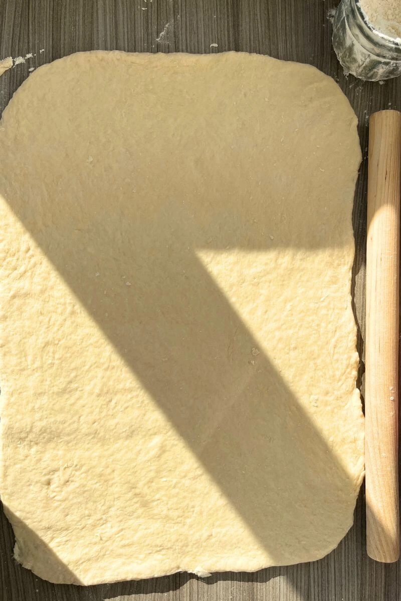 - Roll the dough into a 24×12-inch rectangle on a floured surface.
